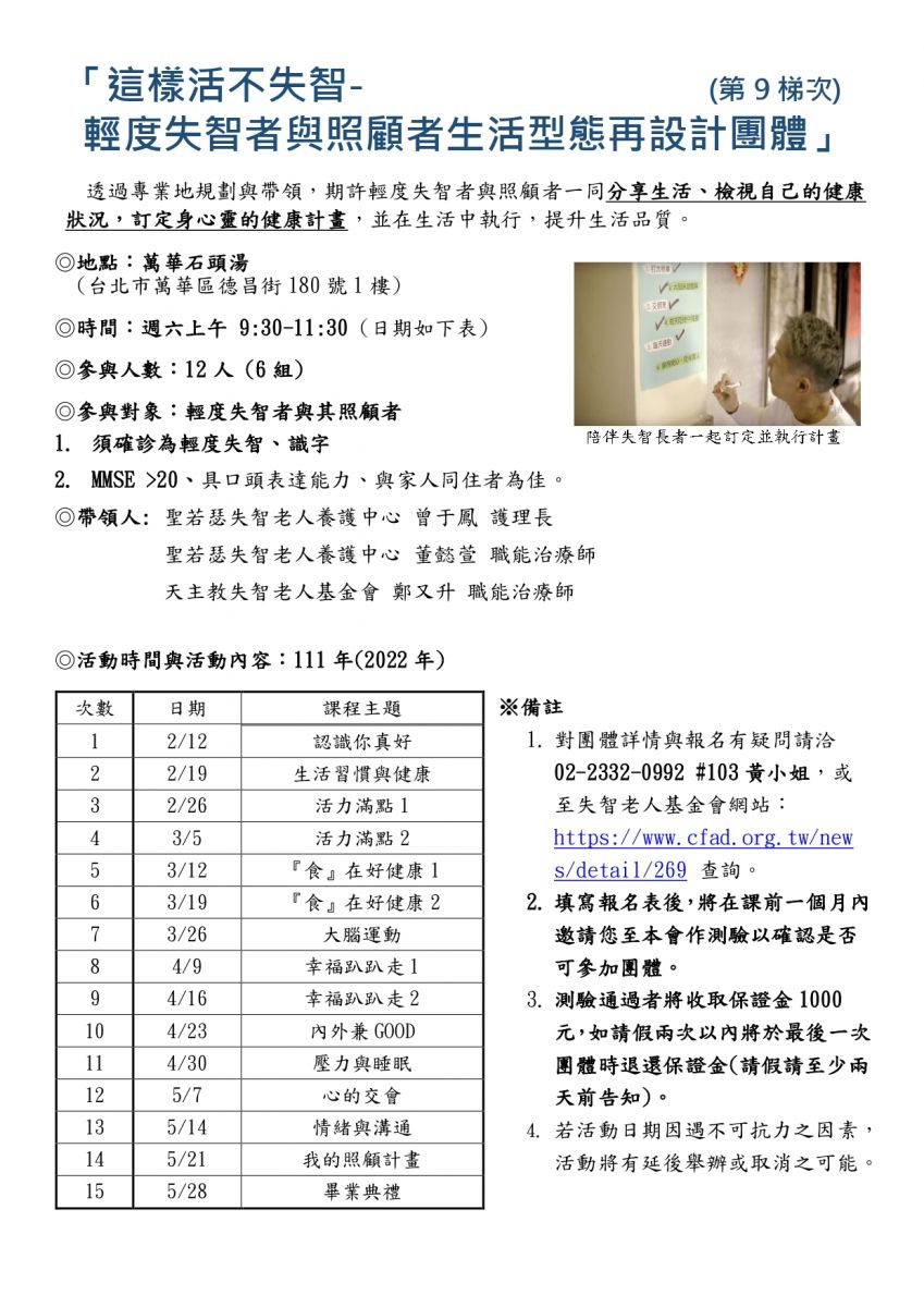 111年「這樣活不失智- 輕度失智者與照顧者生活型態再設計團體」第9梯次,將由專業的職能治療師與護理師規劃與帶領,期許輕度失智者與照顧者一同分享生活、檢視自己的健康狀況,訂定身心靈的健康計畫,並在生活中執行,提升生活品質。