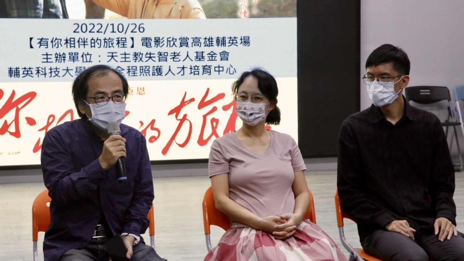 天主教失智老人基金會、輔英科技大學高齡全程照顧人才培育中心於10月26日假輔英科技大學第三教學大樓F301教室攜手合辦「失智症紀錄片《有你相伴的旅程》電影活動」,邀請長庚醫院神經內科主治陳乃菁醫師和本片主角岳朝霖先生、天主教失智老人基金會鄭又升教育研究組組長一同參與映後座談,本場活動學生們發言踴躍,更多了解失智者與照顧者的心路歷程。