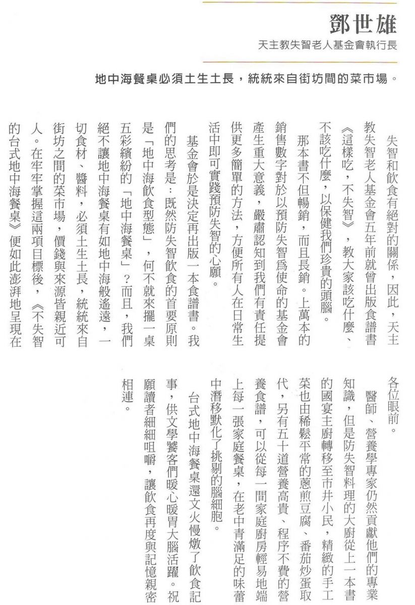 最新研究證實,採用地中海飲食法的人,罹患失智症的機率,大幅降低40%。台灣十大名醫王培寧、徐文俊、陳亮恭、陳達夫、張傑文、葉炳強、蔡佳芬、劉建良、賴德仁、劉景寬醫師共同解密失智症,這樣吃,讓你遠離失智。